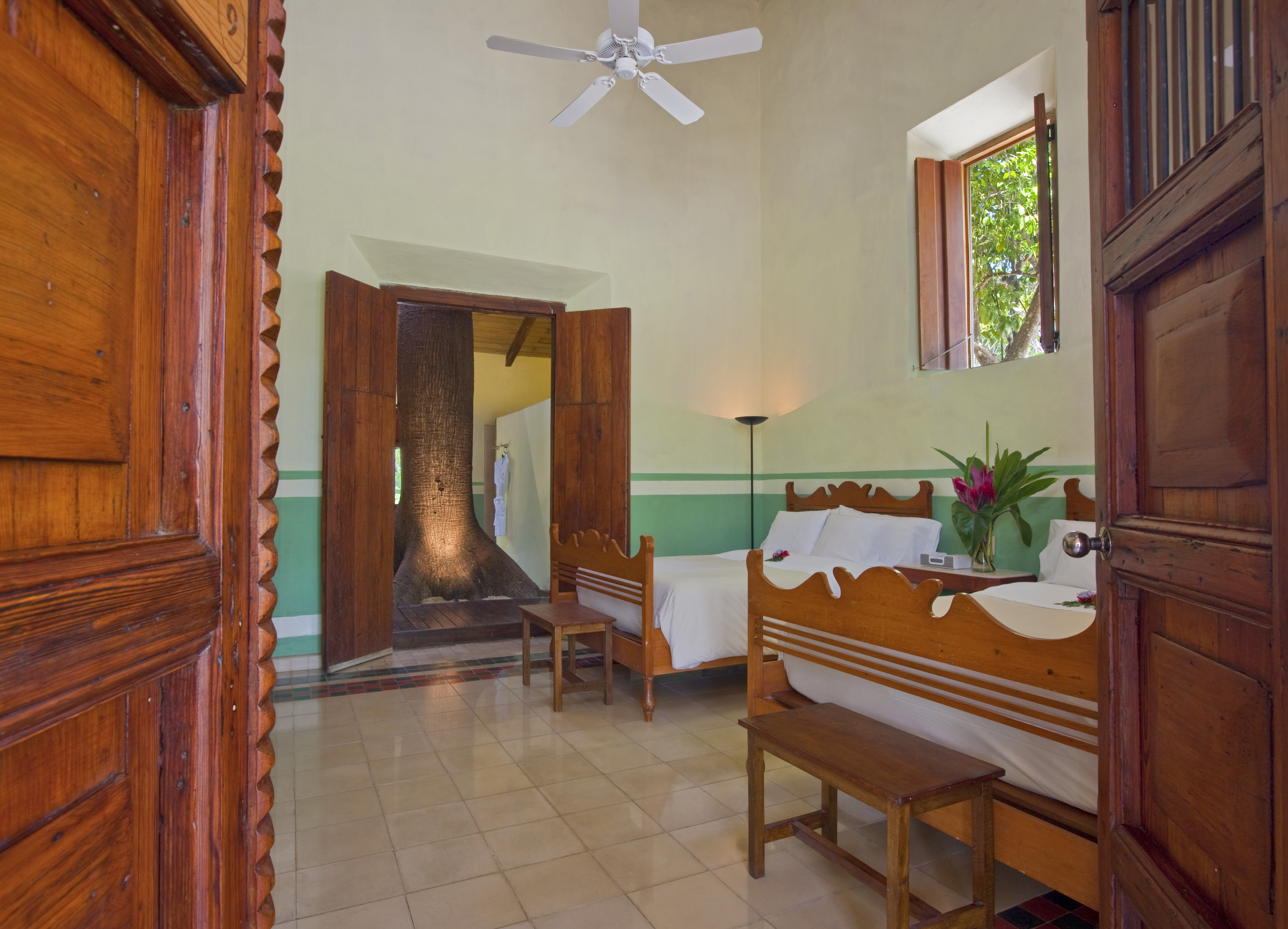 • All 15 comfortable guest rooms have high ceilings, exposed beams, wooden double doors and beds, tiled floors and individual decor.