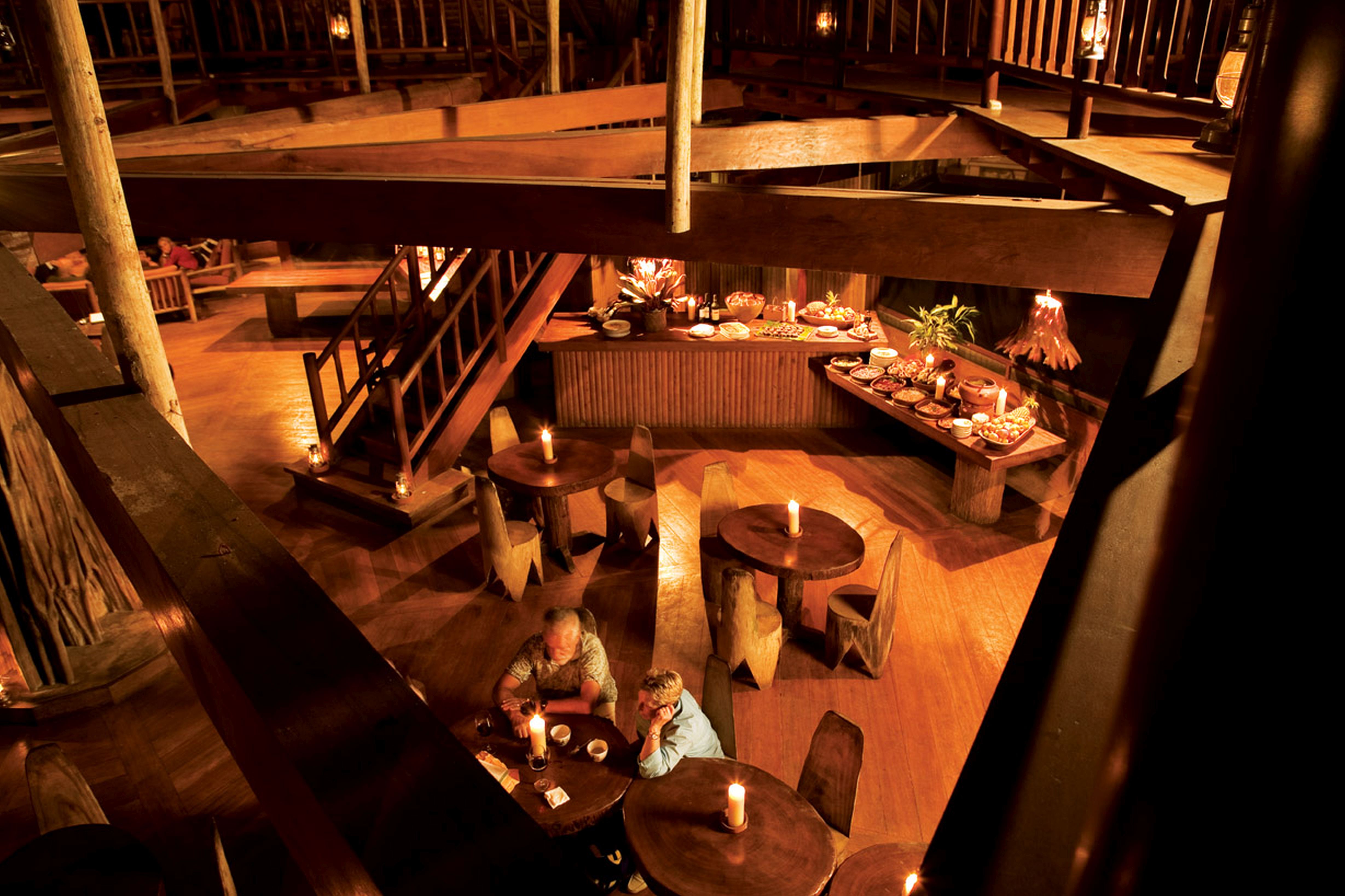 Excursions take guests into the forest and along the river during the days. The lodge also has balconies for bird watching and stargazing and evening nature presentations. To relax, guests can enjoy a massage in the spa, a drink in the bar or swap stories in one of the lounge areas. The dining pavilion, built around the strangely beautiful trunk of a strangler fig, offers well presented cuisine, prepared using local ingredients and native techniques.