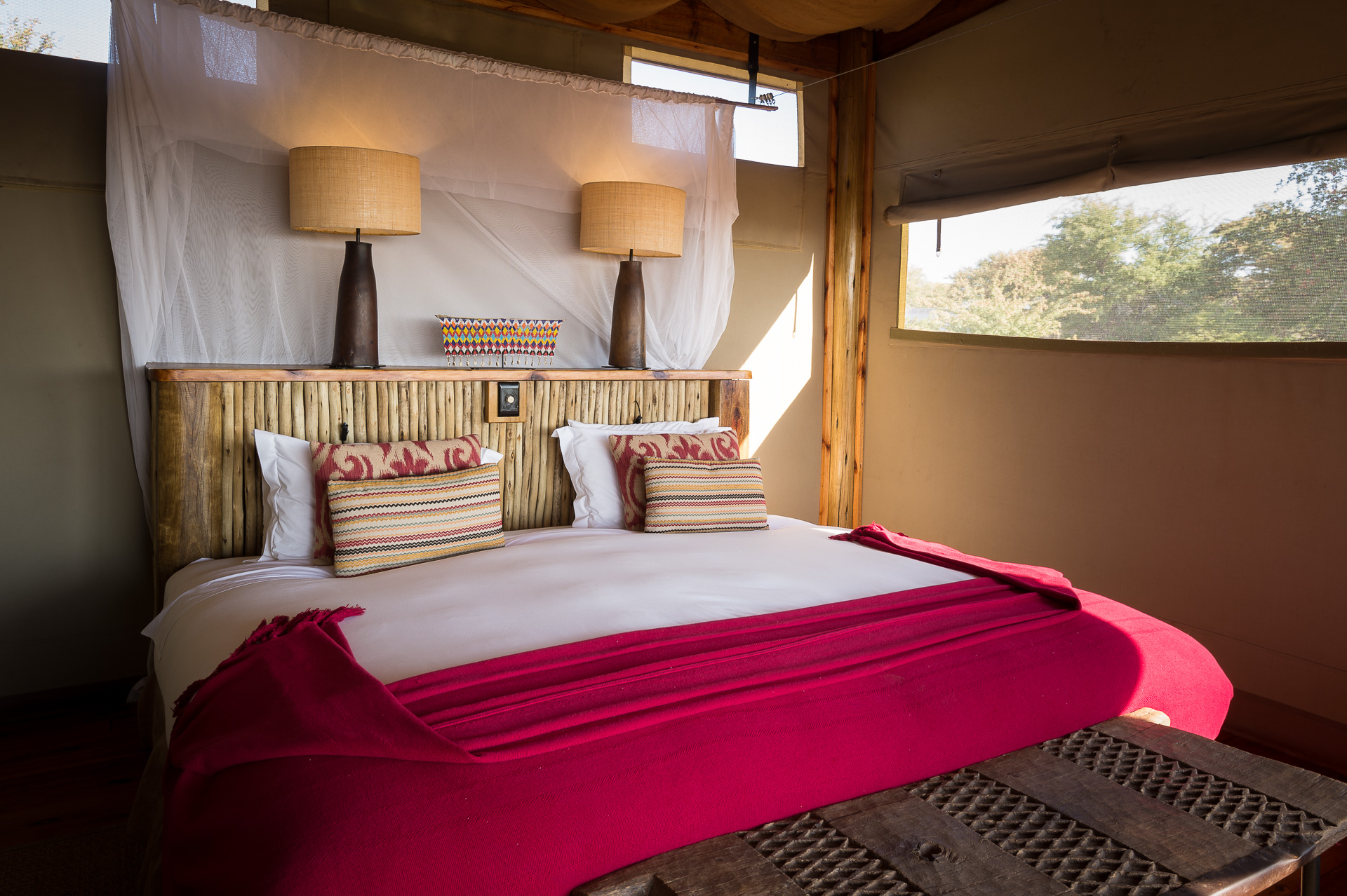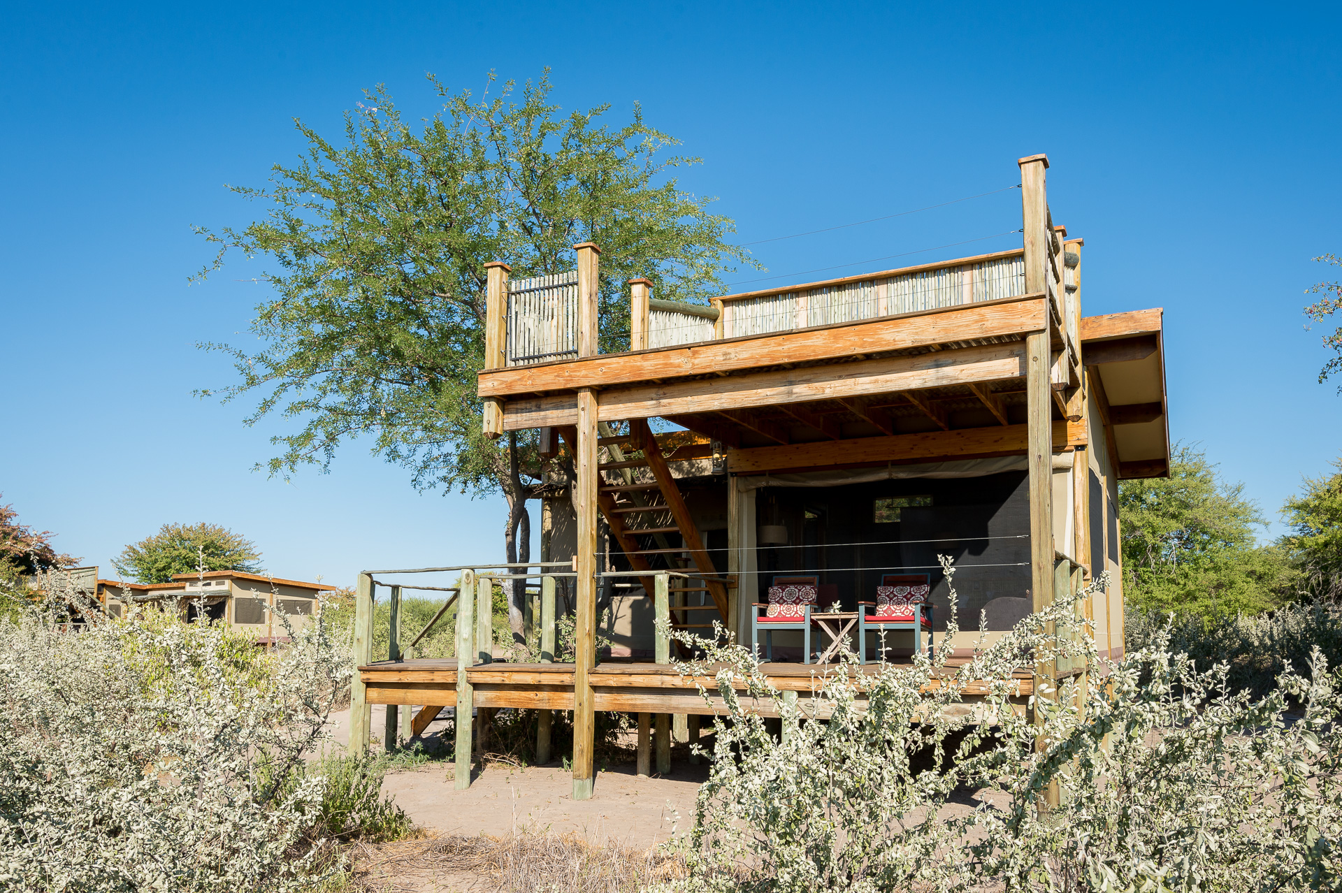 Built from canvas and timber, the 10 solar powered luxury tents have en suite bathrooms and bedrooms leading on to small decks and a flight of stairs to the rooftop deck, with its memorable views.