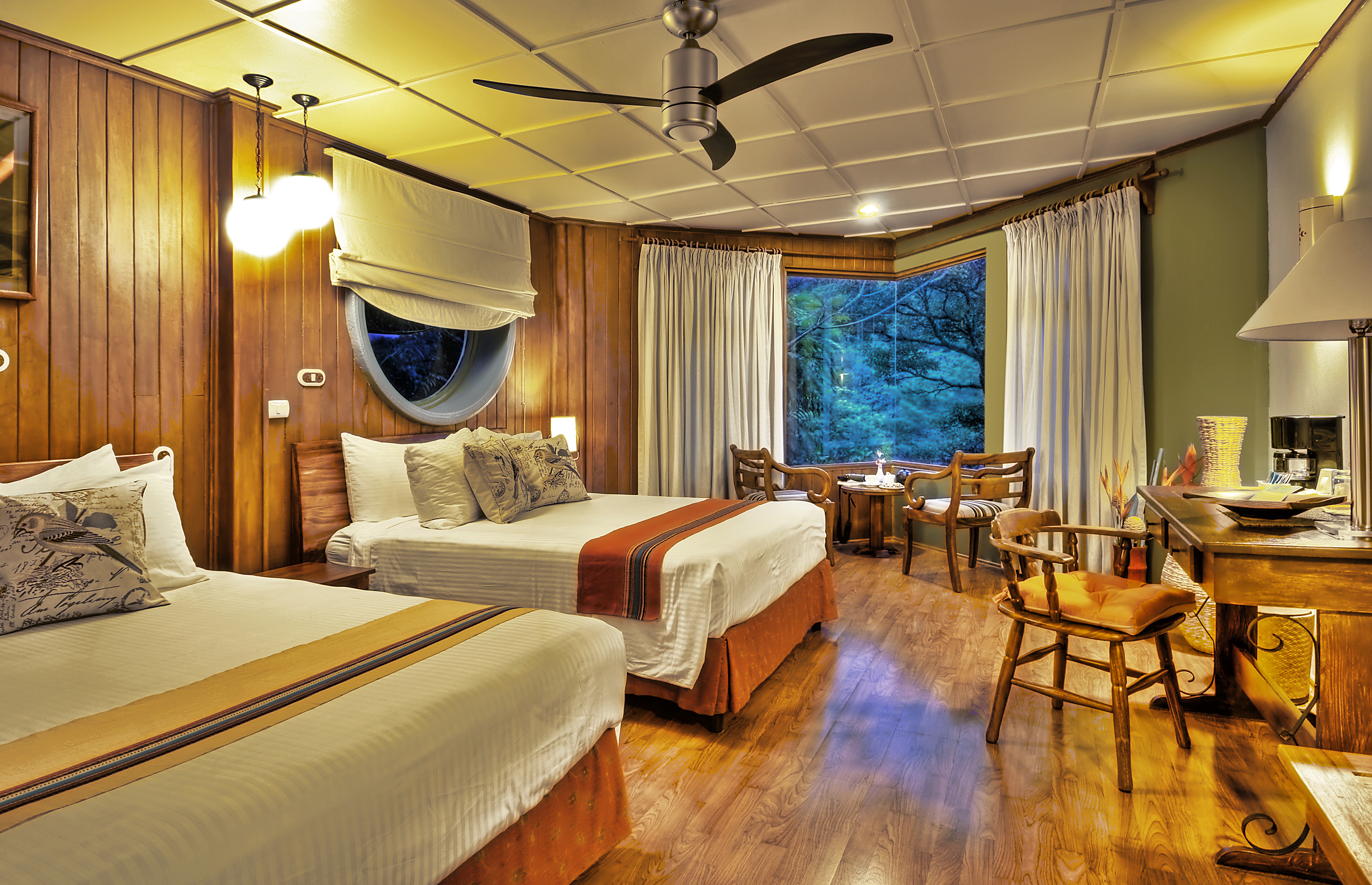 No need to venture far to make exciting discoveries. Explore the lodge’s stunning gardens – the main fern and bromeliad garden, the butterfly and humming bird gardens – and take a dip in the solar heated swimming pool. Then the nearby reserves will entice you with hiking, bird watching with a naturalist guide, horseback riding and zip-lining or hiking through the canopy. The lodge’s bar is set around a fireplace and serves up creative cocktails and the restaurant offers tempting traditional Costa Rican and international recipes.
