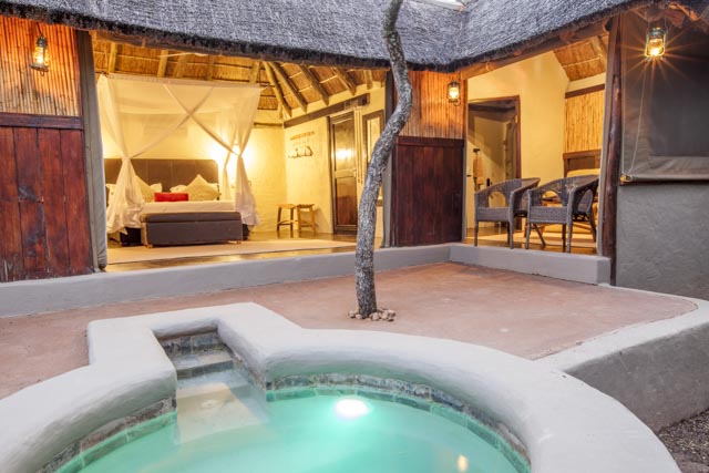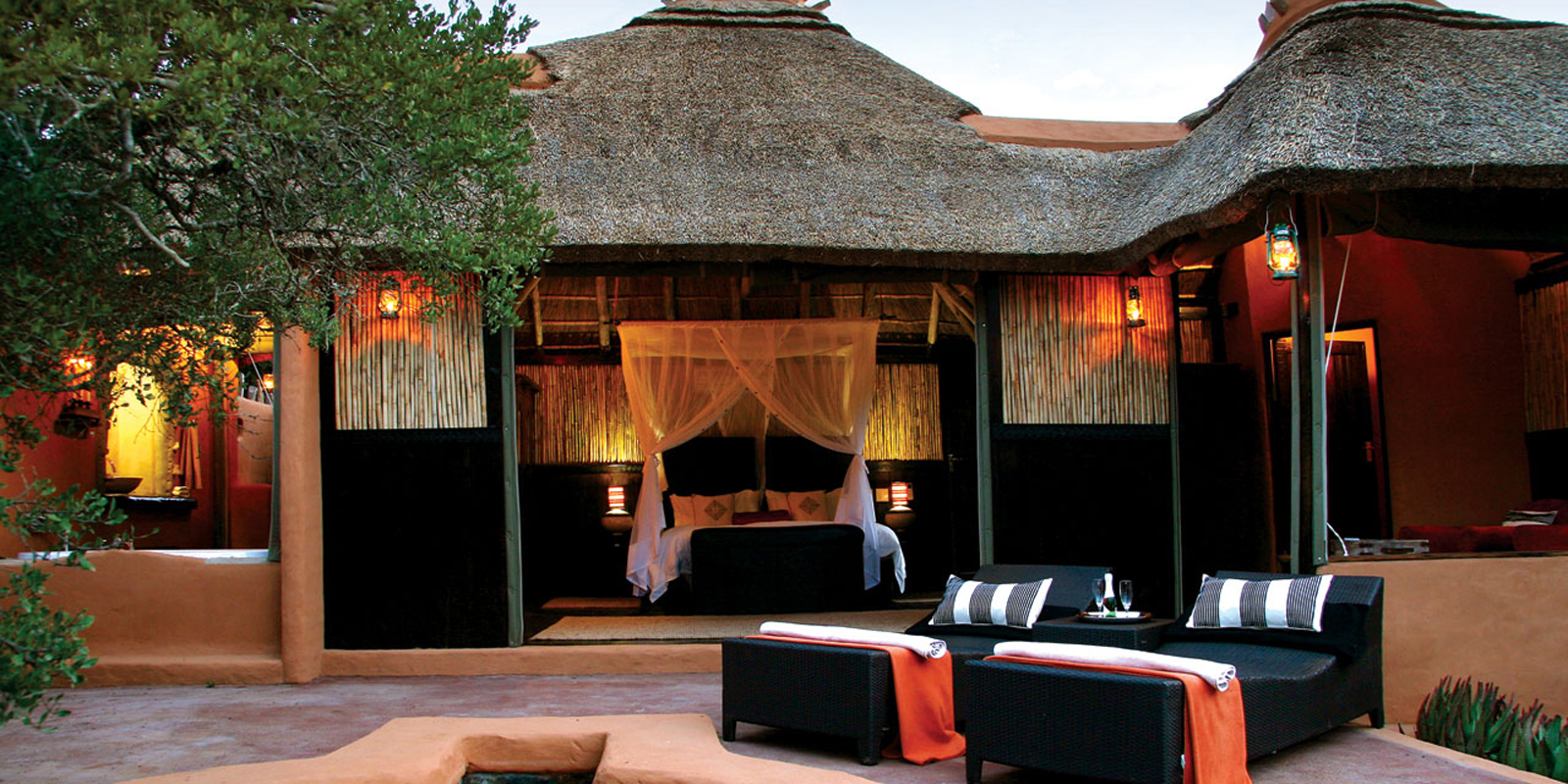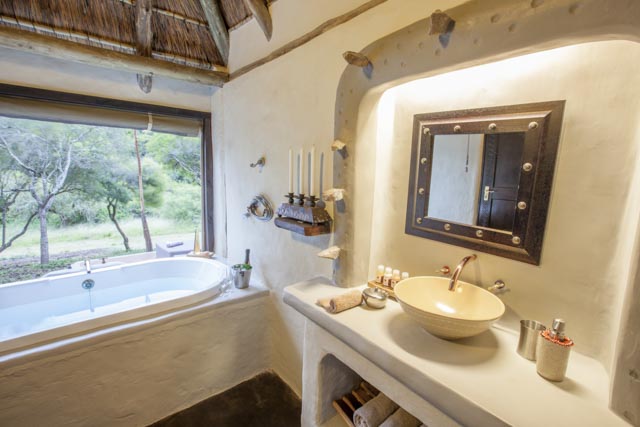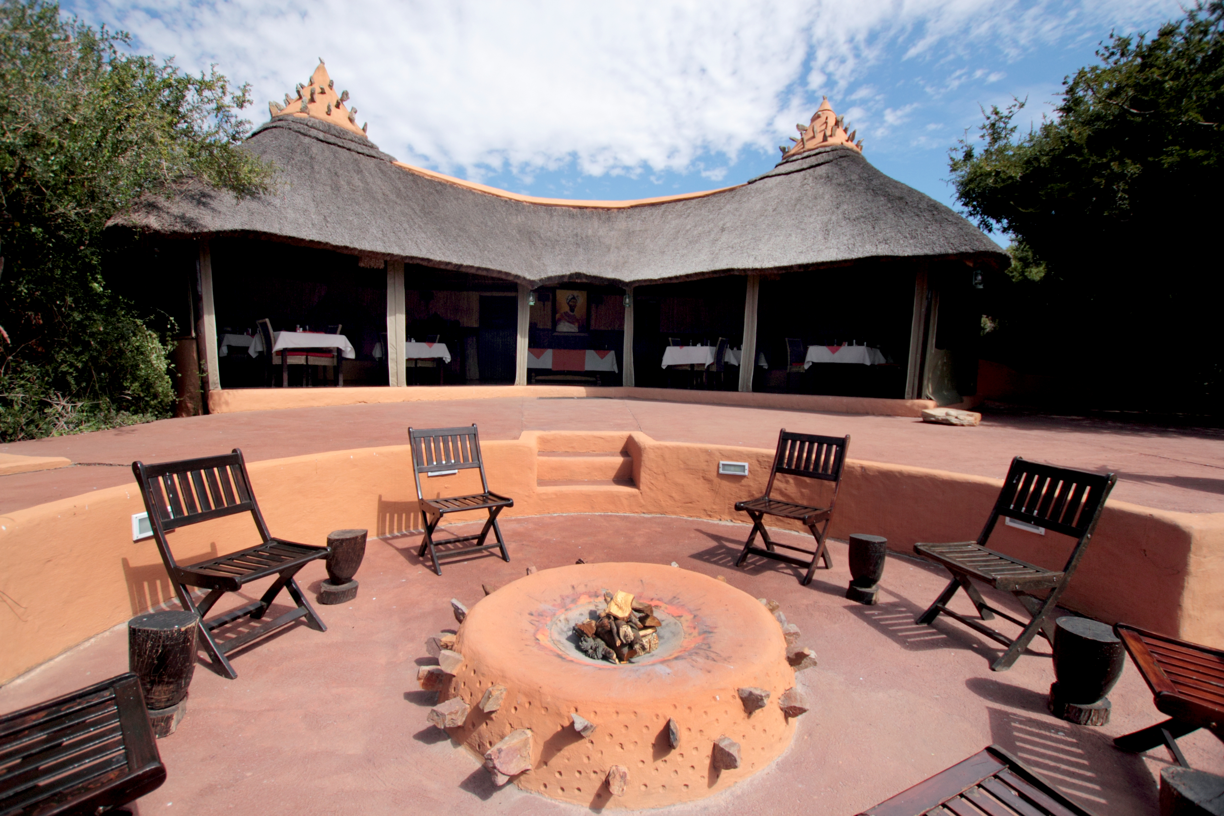 African tribal designs inspire much of the lodge’s décor with fine African bead work and hand crafted designs in evidence throughout. The thatched main lodge and unique safari huts with stone-capped roof tops offer all the comforts of a luxury lodge. The view from the safari huts and lounge area is of the waterhole, where monkeys, antelope and zebra can often be seen.