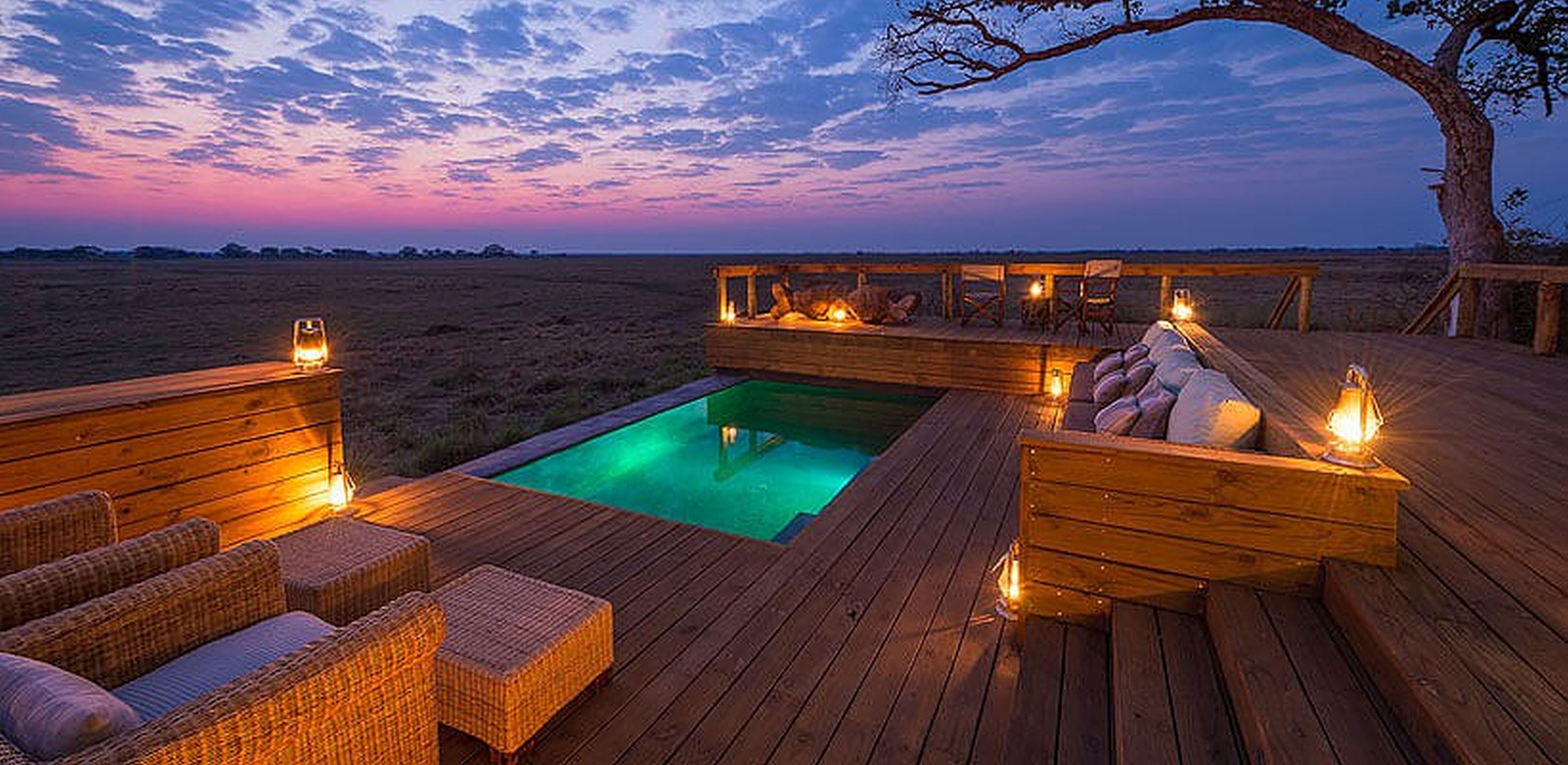 Guests can observe wildlife, including the pride of lions which roam the area, from the viewing decks or outdoor pool. Dining is in the dining area or under the stars and there is a well stocked bar.