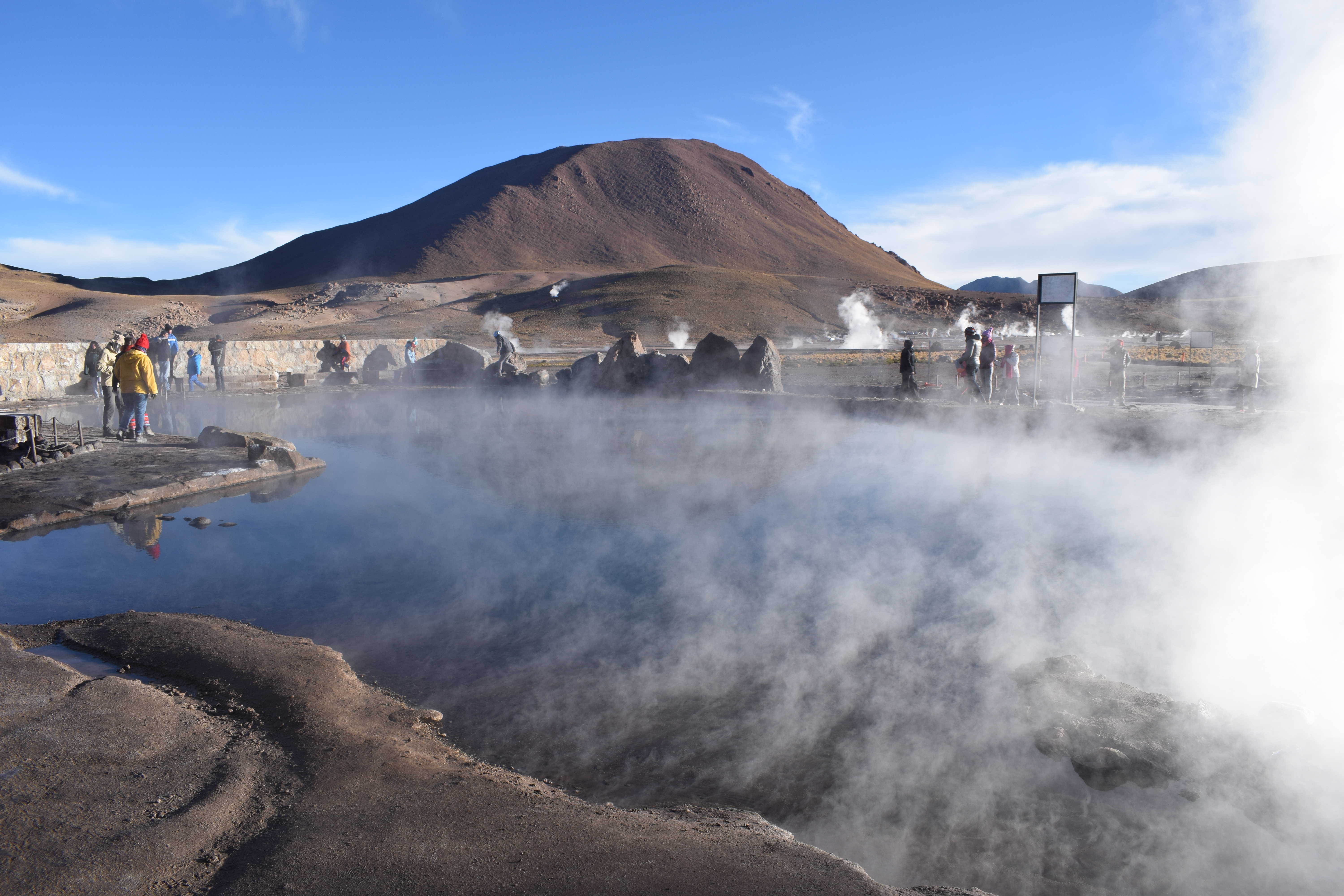 On the final day we went higher still to over 4,000 metres to the valley of the geysers. A very early start is needed so that you can wend your way up to the heights. When you arrive you realise why an early start was needed. As you see the warm steam from the geysers highlighted against the cold air of the early Atacama morning just as the sun is rising and before it heats up the air. A memorable experience.